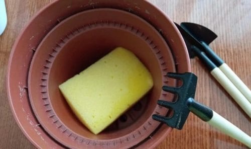 Při přesazování rostlin umísťuji houbu na dno květináče, než přidám drenážní materiál a zeminu.
