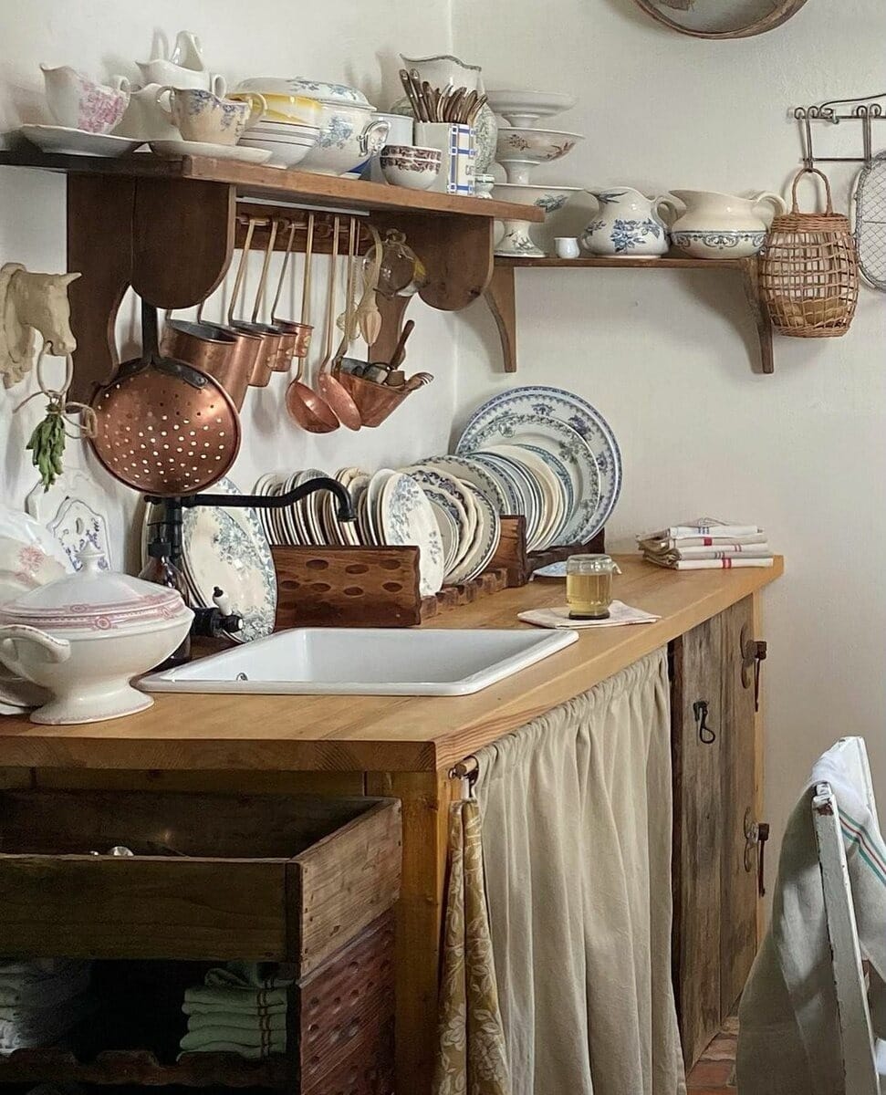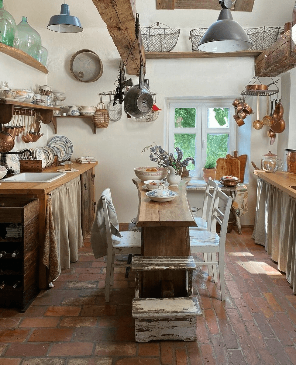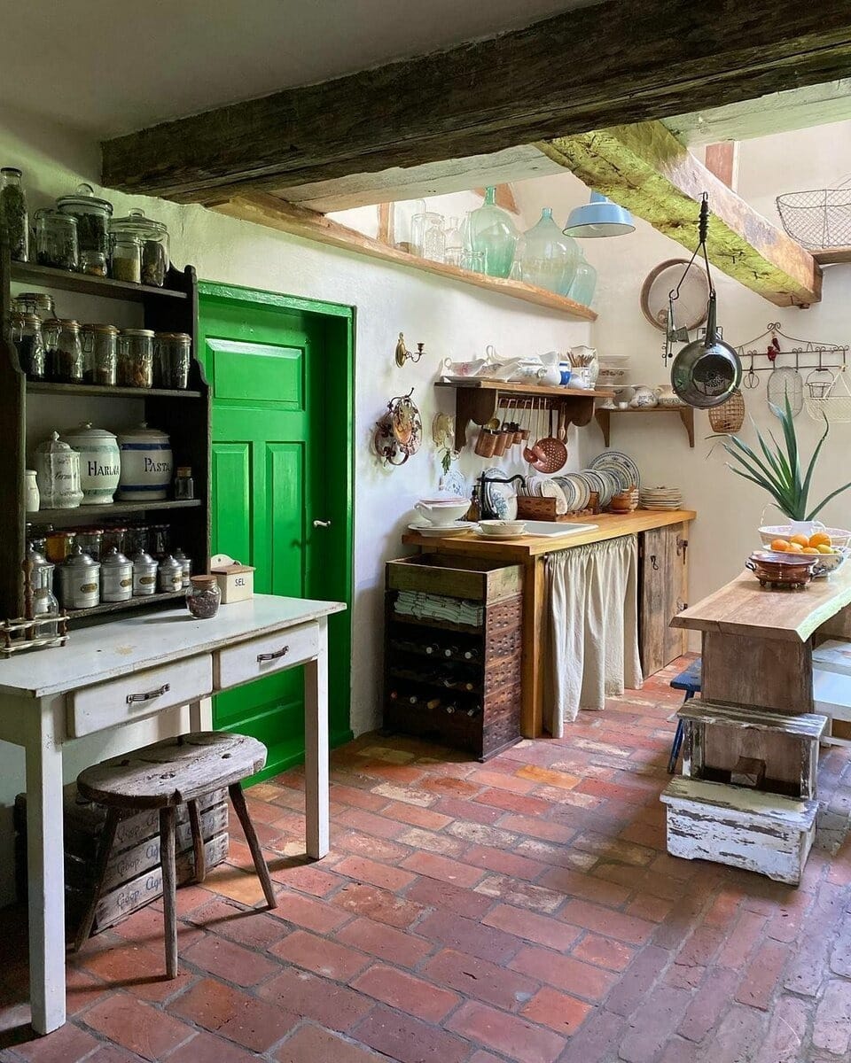 Kuchyně, srdce tohoto domova, vyzařuje nostalgickou atmosféru s holými cihlovými podlahami, jednoduchým stůl a množstvím vintage nádobí na vystavení. Porcelán, keramika a měď zdobí police, evokující pocit starého světa.