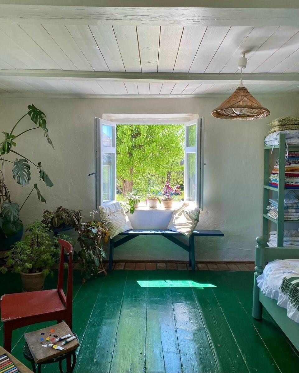 Mezitím květinové truhlíky na stěnách dodávají chodbičce šik, která vede k venkovské zahradě s prádlem schnoucím na provázkách a starou litinovou vanou sbírající dešťovou vodu.