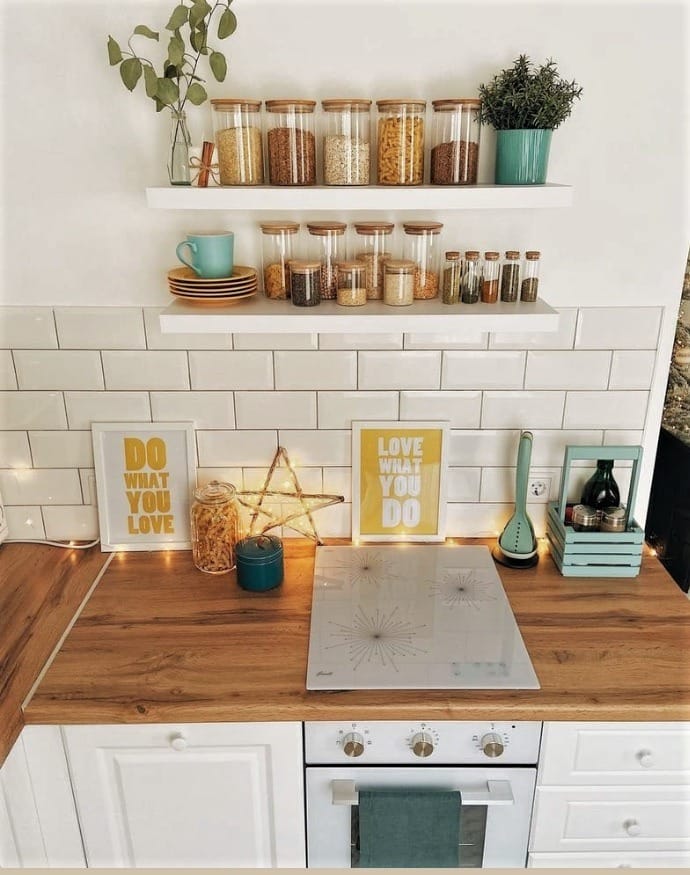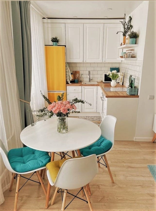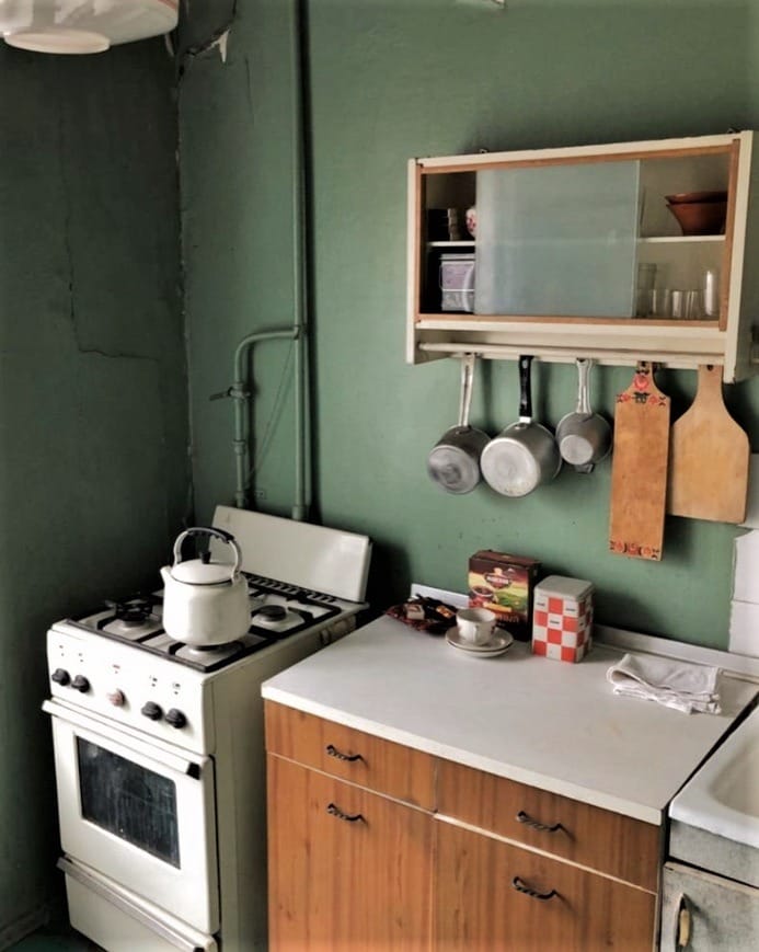 Rohová sestava se sněhově bílými fasádami, kontrastní zástěra z bílých dlaždic a žlutá lednice (ve skutečnosti je bílá – zžloutla kvůli přilepené fólii nahoře), která se stala neobvyklým akcentem, vytvořila jedinečný styl interiéru.
