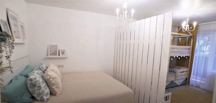 Ložnice byla rozdělena na dvě zóny. Dřevěná příčka ve tvaru… plotu oddělila dospělou ložnici od dětského pokoje.