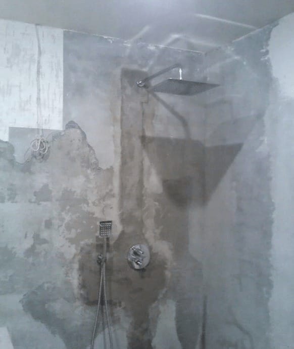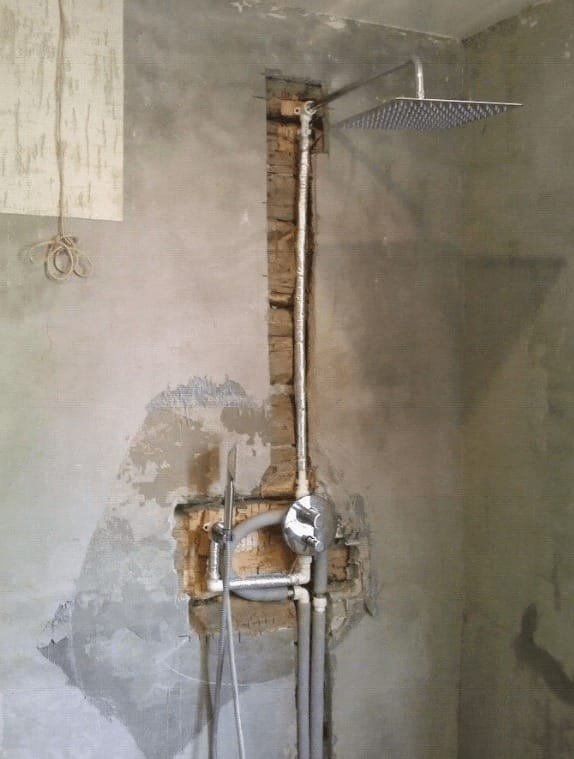 Nejprve se použije vrták, aby se vytvořila drážka ve zdi, kam se umístí všechny potřebné trubky. Jakmile jsou trubky na svém místě, drážka se zapečatí sádrou. Na stěny se pak aplikují béžové dlaždice, které okamžitě prosvětlí a vizuálně zvětší prostor.