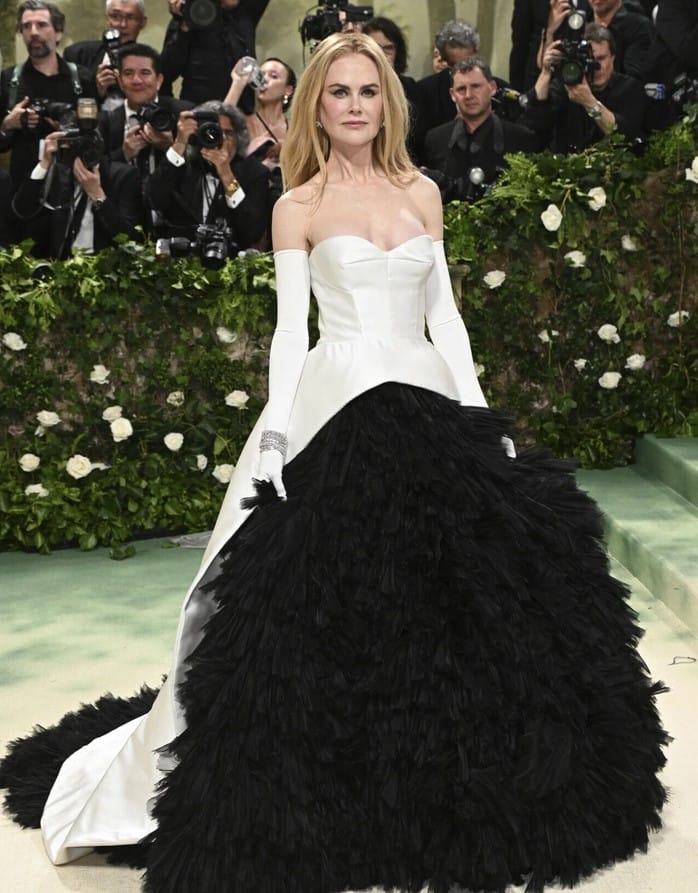 Nicole Kidman se na Met Gala 2024 objevila s elegancí, oblečená do nápadných černobílých šatů zdobených peřím. Tento kreovaný kousek od Balenciaga Couture, vytvořený Demnou, okouzlil přihlížející svým propracovaným designem, který dokonale zapadl do tématu akce „Zahrada času“.