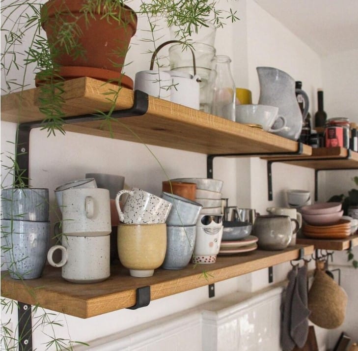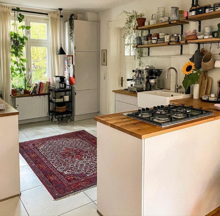 V kuchyni jsou chladné dlaždice zmírněny přítomností vintage koberce, což vnáší nádech nostalgie.