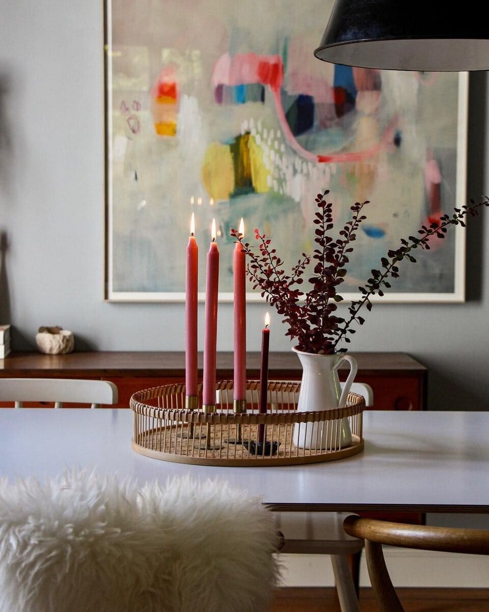 Svíčky zdobící jídelní stůl vydávají útulný svit, zatímco sušené květiny ve stylových vázičkách evokují nádech retro kouzla.