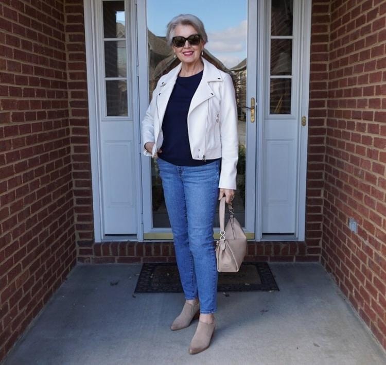 – Šik bílé kožené bundy, která se bez námahy kombinuje s tmavě modrým svetrem, jednoduchými džíny a béžovými doplňky.