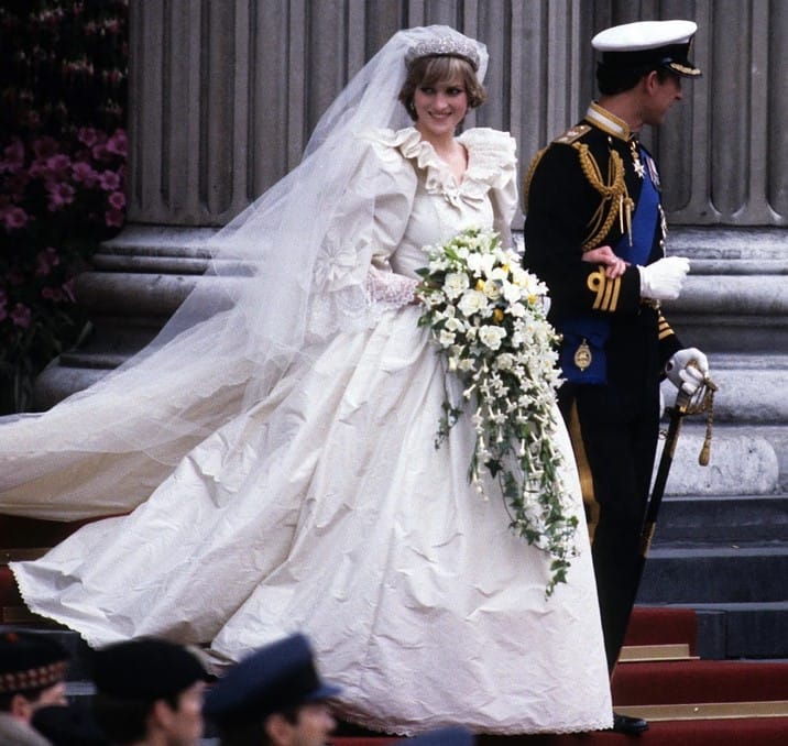 Svatební šaty princezny Diany jsou považovány za jedny z nejikoničtějších v historii. Byly vyrobeny z slonovinového hedvábného taftu a starožitné krajky a zdobily je složité detaily jako flitry, ruční výšivka a perly. Kromě estetické přitažlivosti měla šaty také skryté detaily. Na spodničce byl přišitý zlatý podkovový symbol pro štěstí, zatímco kousek krajky patřící královně Marii zdobil šaty. Navíc návrháři David a Elizabeth Emanuelovi nenápadně zakomponovali malou modrou mašličku na pas, což je tradice zahrnující „něco modrého“ pro štěstí nevěsty.