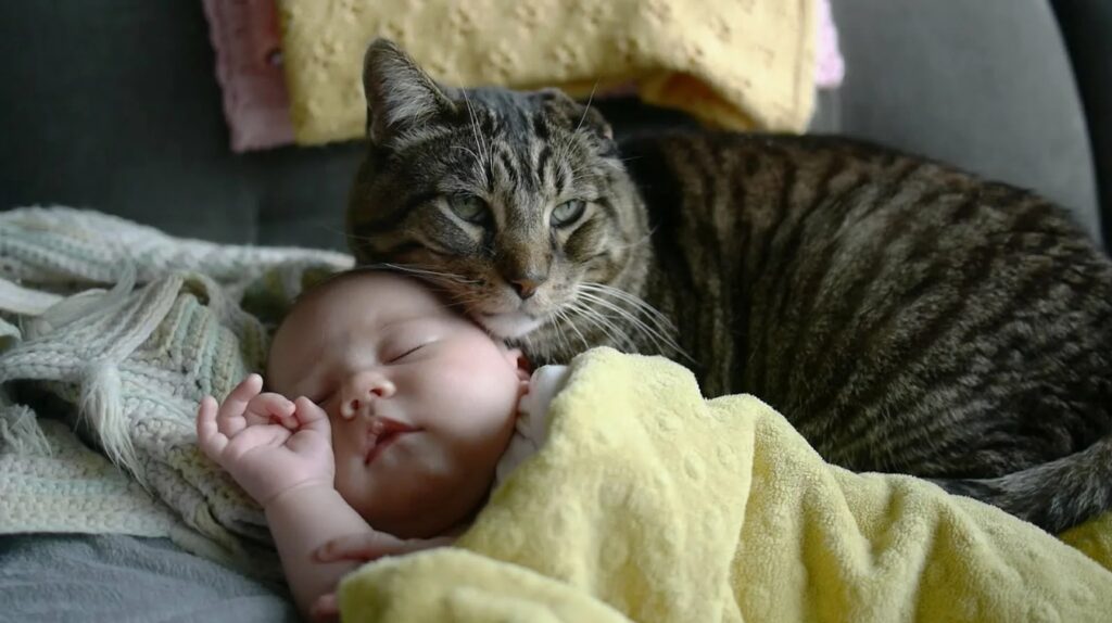 Jedné noci, když dítě znovu pláčalo, Klára se vyčerpáním sesunula do křesla vedle postýlky. Náhle tichý, pruhovaný kocour Barsik opatrně přistoupil a skočil k miminku.