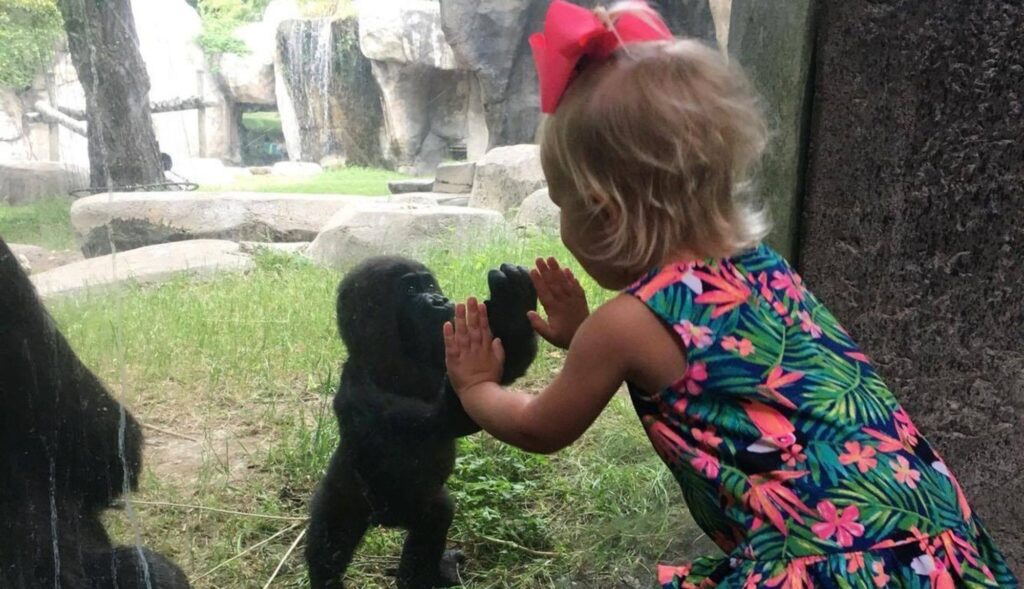 Gorilí miminko udělalo krok vstříc a dotklo se skla svou maličkou rukou.