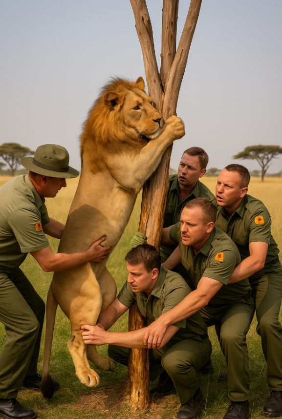 Lev. Velký, hrdý predátor — nyní ležel pod stromem téměř bez hnutí. Jeho hříva byla zacuchaná, oči polozavřené, dech sotva znatelný. Když se přiblížili, ztuhli: tlustá větev sevřela jeho krk jako smyčka. Kůže byla roztržená, krev zaschlá. Bylo vidět, že bojoval. Dlouho. A prohrával.