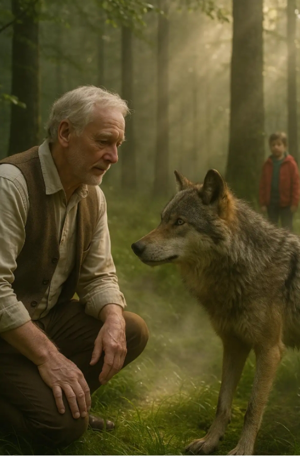 Saša seděl pod smrkem, celý v slzách a škrábancích, ale živý. Když stařec doběhl, vlk už zmizel. Jen stopy tlap na vlhké zemi připomínaly, že tu byl.