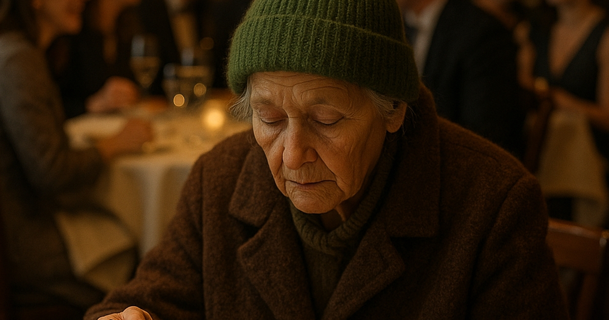Starší žena v opotřebovaném kabátě pomalu otevřela dveře elegantní restaurace.
