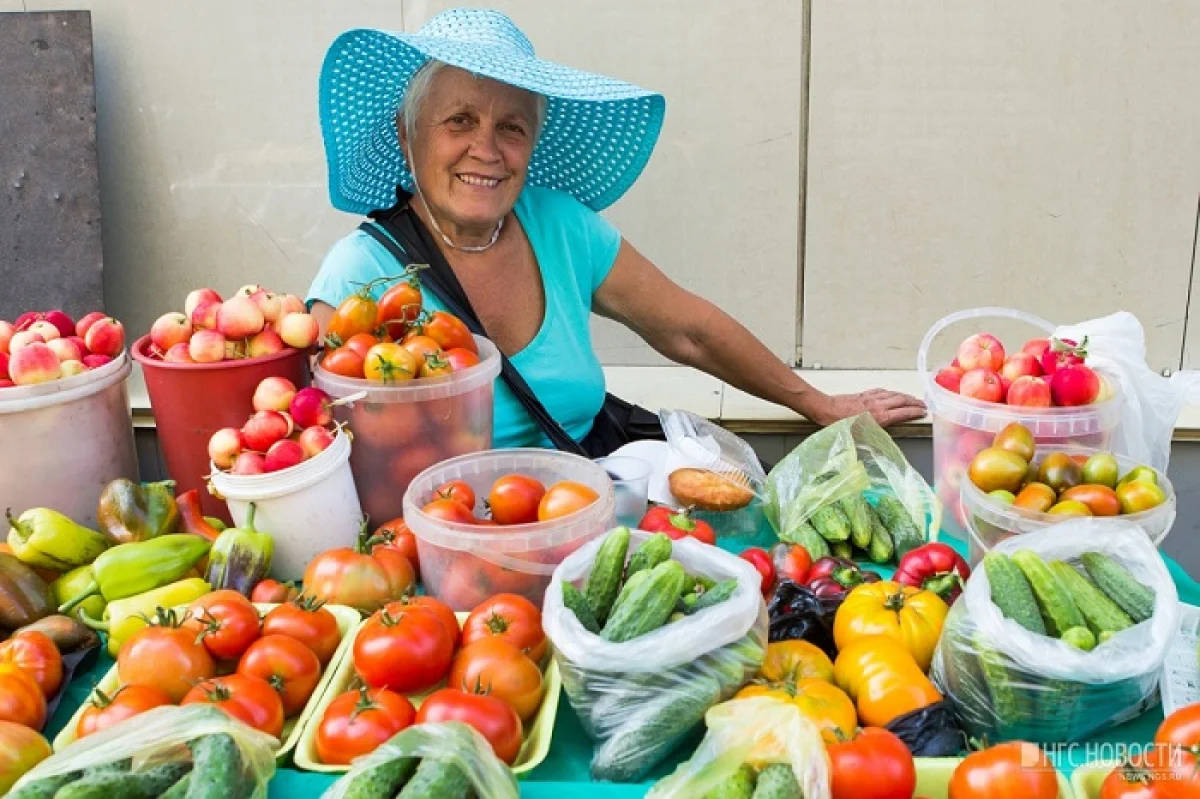 Žena, oblečená ve vybledlý svetr a opranou sukni, měla uspořádaná rajčata, mrkve a okurky.