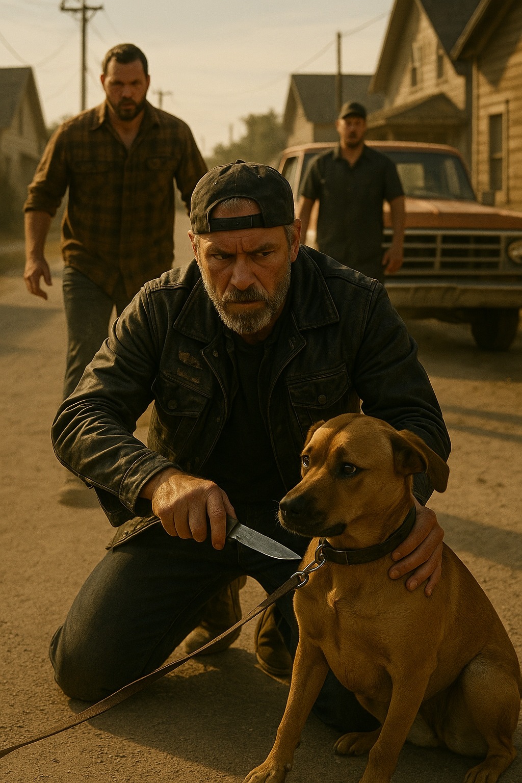 Než jsem stihl cokoliv udělat, už běžel k zadní části náklaďáku s nožem v ruce. Jeden jediný střih — a provaz spadl. Pes se zhroutil na zem, ztěžka dýchal. Motocyklista se sklonil a přikryl ho svým tělem, jako by byl připraven přijmout jakýkoliv útok. Řidič vystoupil a to, co se stalo, zanechalo všechny přítomné v naprostém šoku.