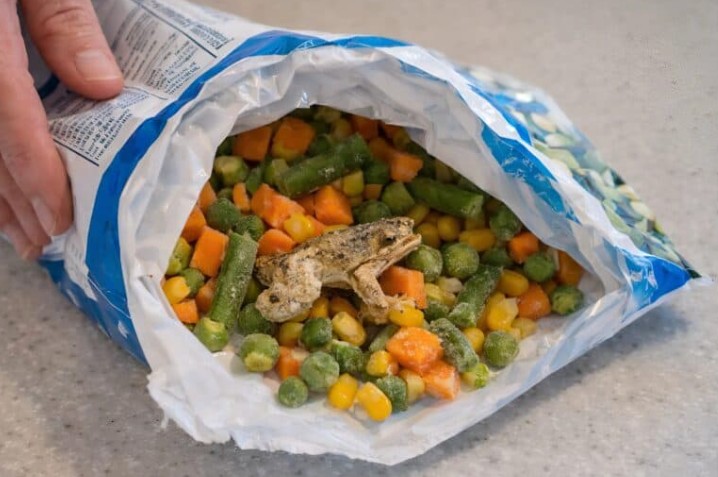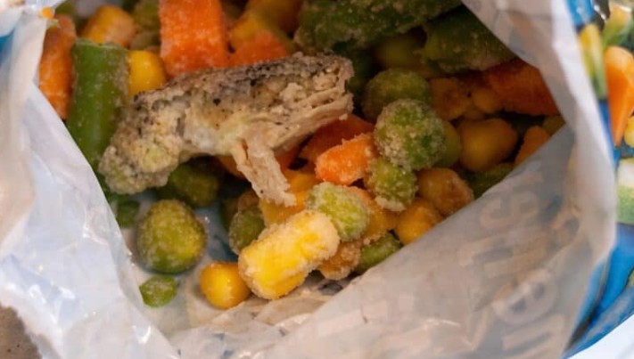 Když mi došlo, že to není zelenina, ztuhla jsem na místě. Když jsem lžící odhrnula ostatní zeleninu, spatřila jsem malé končetiny připomínající prsty ruky. Hned za nimi se mezi ledovými krystalky objevila silueta hlavy. Byl to malý, úplně zmrzlý žabák. Zjevně se do balíčku dostal během sklizně na poli a zmrzl společně se zeleninou, aby nakonec týdny ležel na regálech supermarketu.