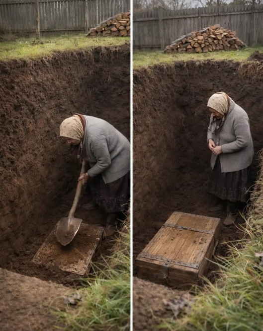 Na dotazy okolí odpovídala babička stručně: její muž jí před smrtí řekl, aby kopala přesně uprostřed pozemku. Nikdo jí nevěřil a bizarní situace vyvrcholila příjezdem policie, kterou zavolali znepokojení sousedé. Právě v tu chvíli však lopata narazila na tvrdý dřevěný předmět. Pod vrstvou hlíny se objevila stará truhla a přítomní s hrůzou v očích sledovali, jak se odklápí víko.