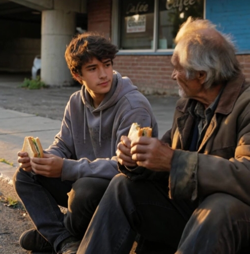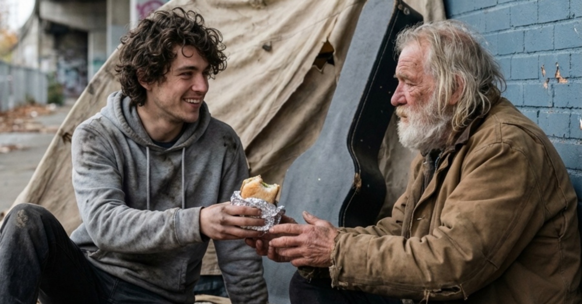 O tři měsíce později jsem žil v levném stanu pod mostem poblíž opuštěného skladu. Pracoval jsem jako umývač nádobí v kavárně, abych měl na jídlo a nové struny. Jednoho odpoledne jsem seděl v uličce a dělil se o darovaný sendvič se zanedbaným starcem, který vypadal ještě zoufaleji než já. Většina lidí ho ignorovala jako obtížný hmyz, ale já jsem mu podal polovinu svého jídla. „Moc toho není, ale je to vaše,“ řekl jsem. On jen tiše poděkoval a dodal, že bych takto žít neměl.