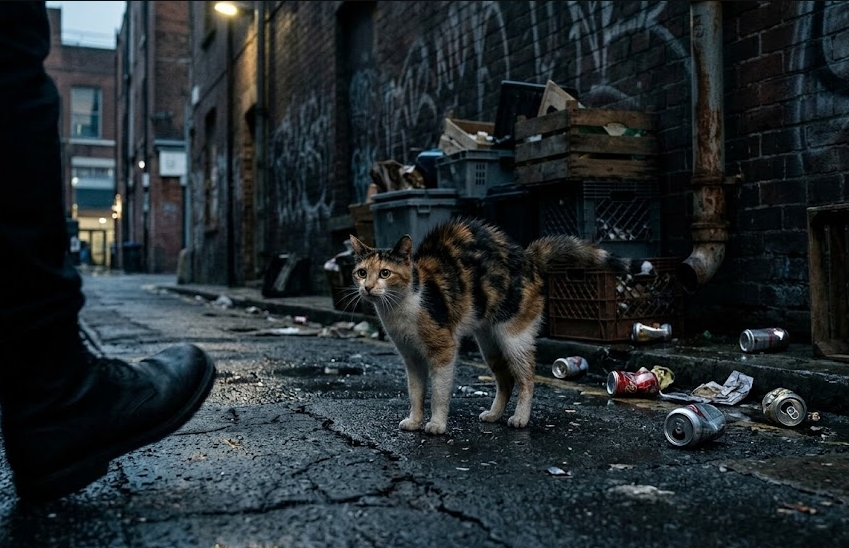 Večerní vzduch byl těžký vůní deště a mokrého asfaltu, když se muž rozvážně procházel úzkou uličkou, jeho boty ostře klapaly o chodník. Hledal rozptýlení, něco, na čem by mohl vybít svou domnělou moc, když si všiml vyzáblé želvovinové kočky schoulené u hromady vyhozených beden. Bez zaváhání zvedl nohu a poslal rezavou plechovku od limonády směrem k tvoru. Kov hlasitě zazvonil o zem a muž se rozesmál krátkým, drsným smíchem, zatímco kočka uskočila zpět, srst naježenou strachem. „Ubohé,“ zamumlal a jeho hruď se nadmula falešným pocitem nadřazenosti. Udělal další dravý krok vpřed, očekávaje, že zvíře zmizí do stínů.