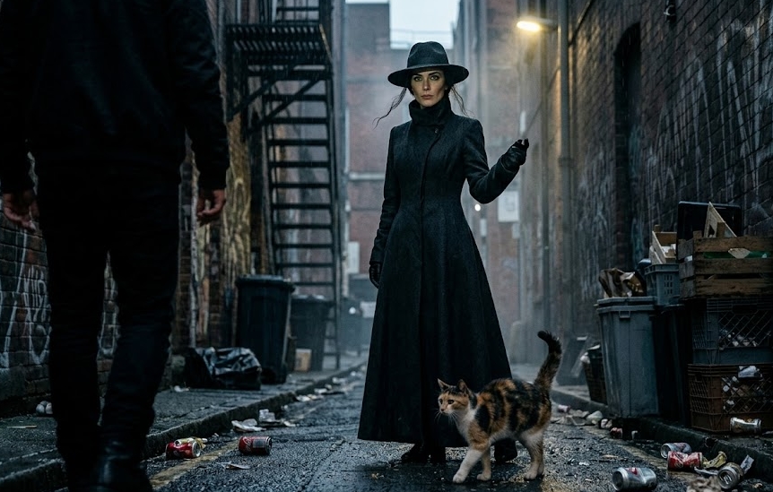 Jen pár kroků od něj, částečně skrytá ve stínu požárního schodiště, stála žena v dlouhém tmavém kabátě. Nepohnula ani svalem, a přesto její přítomnost náhle zaplnila celou uličku. Nekřičela ani nevyhrožovala; jednoduše pronesla jedinou tichou větu, která nesla váhu dávného zákona. „To on není ten, kdo je tady ztracený,“ zašeptala. Ta slova nebyla hlasitá, ale rezonovala frekvencí, z níž mu náhle zeslábla kolena. Ztuhl uprostřed pohybu, jeho noha visela ve vzduchu jako zlomená loutka. Arogance, která ho před chvílí poháněla, se vypařila a nahradilo ji chladné, prázdné poznání, že vstoupil do situace, které nerozumí.