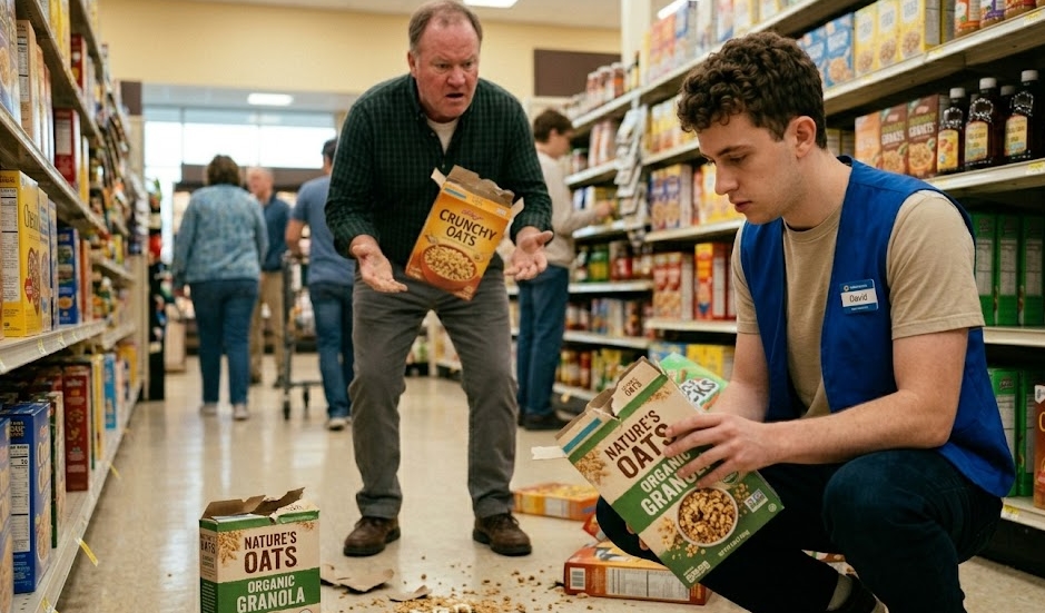 Muž se neobtěžoval s omluvou. Místo toho se otočil s posměšným úšklebkem, tvář měl zarudlou zvláštním, nepatřičným rozhořčením. „Doplňujte to líp,“ odsekl a jeho hlas se rozlehl nad hlavami nakupujících, kteří se zastavili, aby sledovali vzniklé napětí. Pevně svíral vybranou krabici, jako by samotný akt nakupování byl urážkou jeho času a důstojnosti. Očekával, že se zaměstnanec stáhne nebo nabídne naučenou firemní omluvu, ale mladík jen klidně pohlédl na nepořádek na zemi.