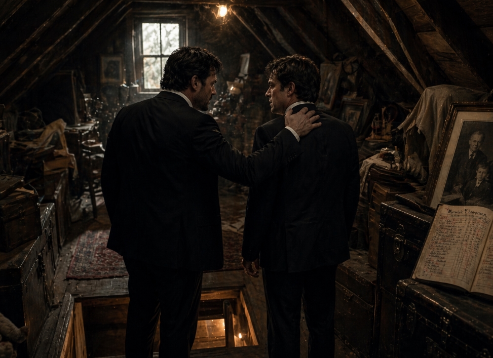 Elias otočil hlavu a jeho pohled sklouzl od bratra k tmavému obdélníku v chodbě pod stropem. Uvědomění ho zasáhlo silou ledové vlny: Julian nebyl ten, kdo peníze schovával; on byl ten, kdo schovával důkazy o krádeži někoho jiného. Chybějící finance neskončily u bookmakera; před lety je odklonil „důvěryhodný“ obchodní partner jejich otce a Julian v tichosti rozprodával vlastní majetek, aby díru zalepil a zabránil tajemství zničit otcovu posmrtnou pověst. Účetní kniha nebyla záznamem Julianovy chamtivosti, ale mapou jeho oběti.